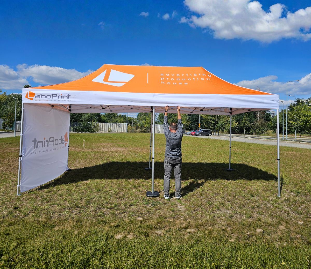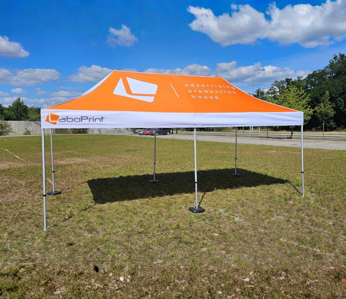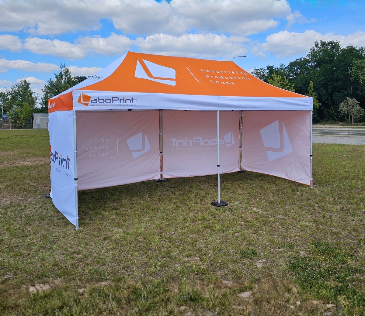 Reklamtält med tryck erbjuder en stor exponeringsyta för marknadsföringsbudskap – två sidoväggar, en bakvägg och taket kan användas för grafik. Tältet i vårt sortiment har måtten 3 x 6 m och är tillverkat av en robust konstruktion samt vattentåligt material med tryck av högsta kvalitet.